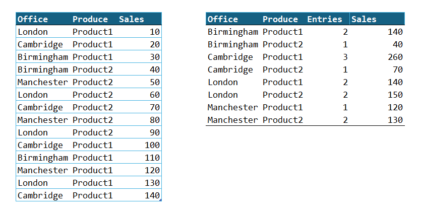 = LET( distinctCategories, SORT(UNIQUE(SalesTbl[[Office]:[Produce]]), {1,2}), office, CHOOSECOLS(distinctCategories, 1), product, CHOOSECOLS(distinctCategories, 2), entries, COUNTIFS(SalesTbl[Office], office, SalesTbl[Produce], product), sales, SUMIFS(SalesTbl[Sales], SalesTbl[Office], office, SalesTbl[Produce], product), HSTACK(office, product, entries, sales) )- SergeiBaklanDiamond Contributor
