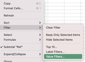 Hi- I am trying to figure out how to filter within my sum values final column of my pivot table. I need to look at values higher than 500 and less than 1000 only within the values and I cannot filter on this column to enable looking between the values