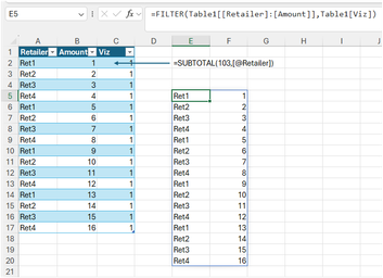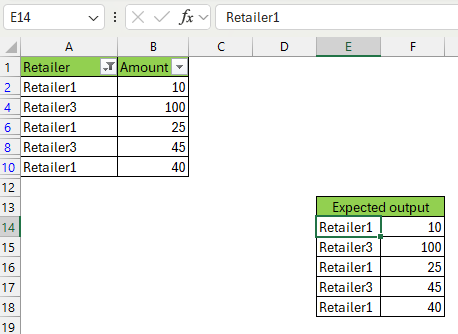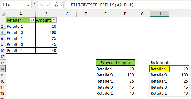 I have a dataset from A1:B11 (in real case many more). I apply a filter on dataset, for example filter data for Retailer1 and Retailer3. I want on a separate sheet to filter these visible cells using formula (not VBA). Preferably using a generic LAMBDA function like =FILTERVISIBLE(A2:B11). Any thought or idea to achieve it?