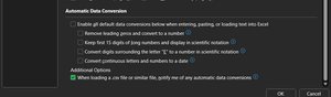 Hello, I have been losing data unwittingly because Excel is automatically converting my .csv data into dates without telling me. I have specifically deselected all of the options for enabling aut...