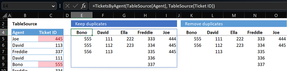 in K4:=TicketsByAgent(TableSource[Agent],TableSource[Ticket ID],TRUE)Where TicketsByAgent is LAMBDA function: