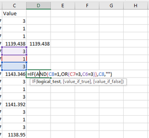 =IF(MOD(ROW(B5),4)=1,IF(AND(C4=1,OR(C3=3,C2=3)),C5,""),"")