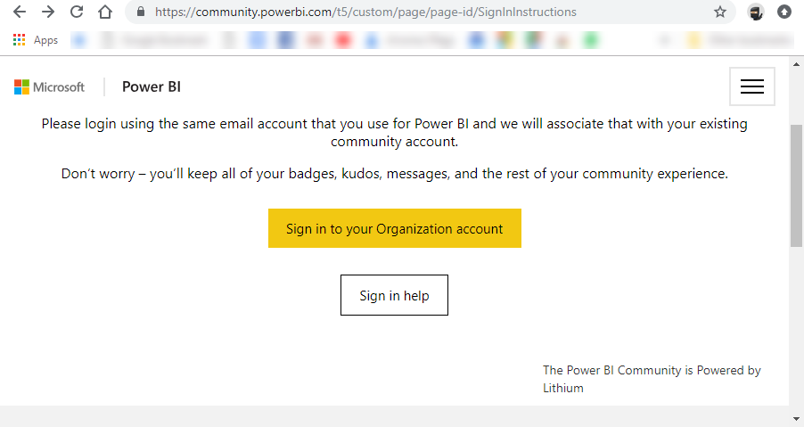 With the latest change in the Login page for PowerBI Community, I'm not able to log in using my personal account. Is anybody facing this issue? I get directed to the https://community.powerbi.com/t5/custom/page/page-id/SignInInstructions which asks me to sign-ing to your organization account.