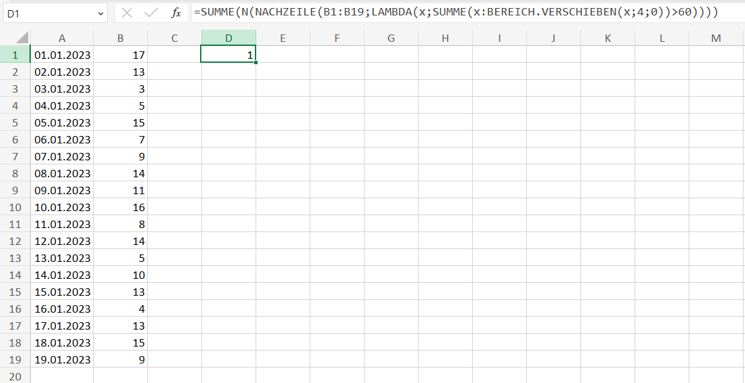 =SUM(N(BYROW(B1:B19,LAMBDA(x,SUM(x:OFFSET(x,4,0))>60))))