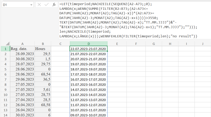 So lets take the first row as an example, the registration date is 28-09-2023. Meaning that i need to know if there is 3848 in the column "hours", in the periode 29-09-2020 - 28-09-2023 (3 years). But that is just an example, like in your formula the period that has the 3848 hours can be in any 3 year period with in the allowed dataset. (It would also be preferable if the period that fulfills the 3848 hours, would be visible in some way. Maybe if Row A5 - A50 fulfills the 3848 hours, it would be shown that it is these specific rows that fulfill it).