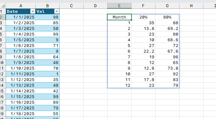 =LET( month_name, MONTH(DemoTbl[Date]), fn, LAMBDA(v, Thunk(PERCENTILE.INC(v, {0.2, 0.8}))), agg, GROUPBY(month_name, DemoTbl[Val], fn, , 0), i, TAKE(agg, , 1), thunks, TAKE(agg, , -1), header, {"Month", "20%", "80%"}, pcntl₁, MAP(thunks, LAMBDA(ϑ, INDEX(ϑ(), 1))), pcntl₂, MAP(thunks, LAMBDA(ϑ, INDEX(ϑ(), 2))), result, HSTACK(i, pcntl₁, pcntl₂), VSTACK(header, result) )The second goes back to the calculation of percentiles and calculates them separately so that thunking is avoided.