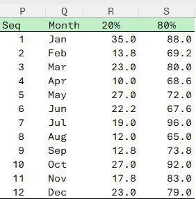 =LET( month_name, HSTACK(MONTH(DemoTbl[Date]), TEXT(DemoTbl[Date], "mmm")), fn₁, LAMBDA(v, PERCENTILE.INC(v, 0.2)), fn₂, LAMBDA(v, PERCENTILE.INC(v, 0.8)), header, {"Seq", "Month", "20%", "80%"}, agg, GROUPBY(month_name, DemoTbl[Val], HSTACK(fn₁, fn₂), , 0), result, VSTACK(header, DROP(agg, 1)), result )- Patrick2788Silver Contributor