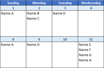 Is there a way to auto-populate the name from a column on an excel sheet into the corresponding date on the excel calendar based on the date entered in a different column on the sheet? For example, on sheet 1 there are names listed in column A and appointment dates listed in column H. Each additional sheet is a monthly calendar template. I need the name to auto-populate on the calendar based on the date entered in column H. Also, there could be multiple names for each date.