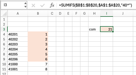 For example what I want is: in this cell (orange in in picture) show me values from column B, that have in column A in their name first two digits 40*. OR in this cell show me values from column B, that have in column A these numbers 40201, 40202, 40203.....).
