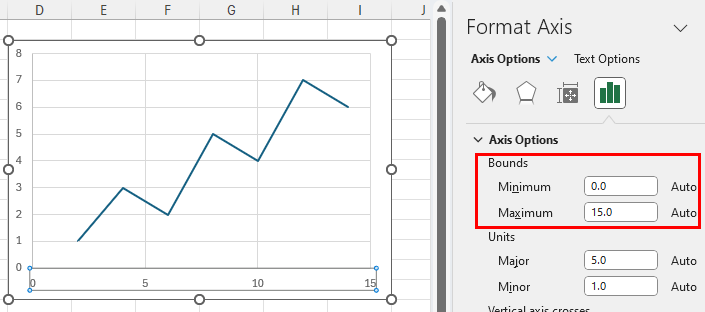 For most chart types, Excel treats the x-axis as text unless it is a date axis. Setting a minimum and maximum of text values makes no sense.