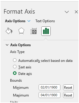 pippo02 On the X-axis that only works with Date values. If your labels on the X-axis are numbers like 1, 2, 3 ,4, 5 etc. you can mimic this behavior by setting the axis type to 'Date axis'. This will then trigger default boundaries from 1 January 1900 to let's say 15 January 1900. Now you can narrow down the displayed 'date range' by changing the minimum and maximum bounds.