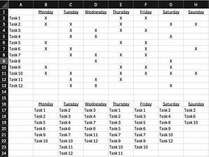 Hello, here is an example data set I am dealing with and what I am trying to find a formula for: In reality, I have about 85 tasks. In the second table, I want it to return for each day...