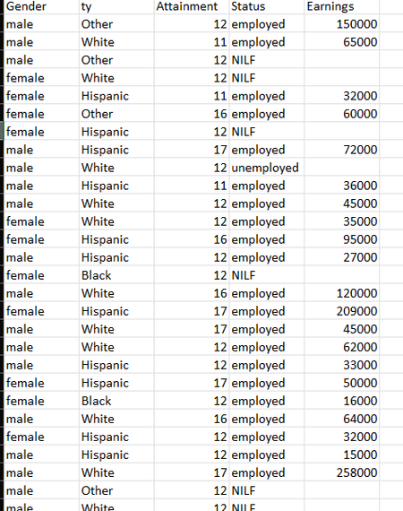 If I were to have a column, say of 2000 males or females, entered in a column (in a random order), and their income in another column, how would I select only the data so that I can create a scatter ...