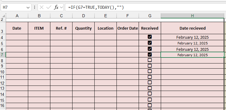 BUT instead I would recommend just get rid of the checkboxes and just use the Date recieved and if there is a date there then it is recieved and if not then it is not. And add the shortcut to let others know how to easily enter that date (CTRL-;) so something like: