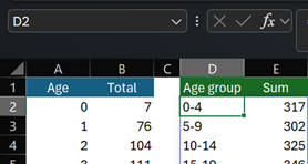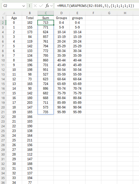 =LET( groupedAge, GROUPBY( SCAN("", A2:A101, LAMBDA(ageRange,age, IF( MOD(age, 5) = 0, TEXTJOIN("-",, age, age +4), ageRange ) ) ), B2:B101, SUM,, 0 ), SORTBY( groupedAge, --TEXTBEFORE(CHOOSECOLS(groupedAge, 1), "-") ) ) - SergeiBaklanDiamond Contributor