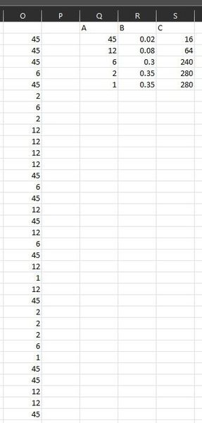 The first column then gives you a list of 800 randomized numbers with the correct frequency for each of the 5 numbers (45, 12, 6, 2, 1).