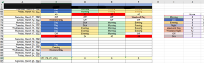 So say there is a weekend (worth 12 hours), four "day" shifts (worth 8 hours each) and two off shifts (worth 0 hours each) and get the total sum at the bottom of each week, so for this one it will be 44?