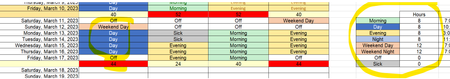 how can I take the values from the table on the right and total them up at the bottom of the weekly tally on the left? So say there is a weekend (worth 12 hours), four "day" shifts (worth 8...