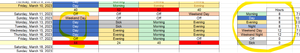 how can I take the values from the table on the right and total them up at the bottom of the weekly tally on the left? So say there is a weekend (worth 12 hours), four "day" shifts (worth 8...