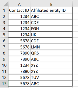 Hello everyone! I have a table with Contact IDs in column A, and portfolios in column B that are to be assigned to the contact ID. As you can see, there are duplicate contact IDs. I need to redu...