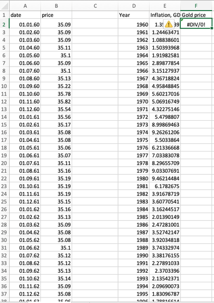 Please see the screenshot below. I'm trying to match up two lists one has the monthly price and the other is a yearly inflation rate. I'm trying to take the annual average of column B so that I only ...