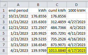 Wow, just 1000 kWh?! Your usage must be a lot more frugal than mine. Good for you!