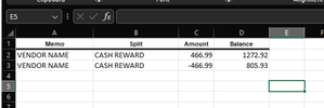 [We just got confirmation from one of our credit card companies that a charge that was incurred back in December has been credited back to our account, but that credit (refund) was in February. Those two transactions appear on the credit card statements of two different months; I want to keep them in my Excel tracking sheet with the dates in those two months, so that the running balances for the full history make sense.]