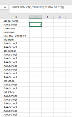 =SUM(--(FREQUENCY(IF(UPPER(RIGHT(D2:D10000,6))="SCHOOL",MATCH(D2:D10000,D2:D10000,0)),ROW(D2:D10000)-ROW(D2)+1)>0))