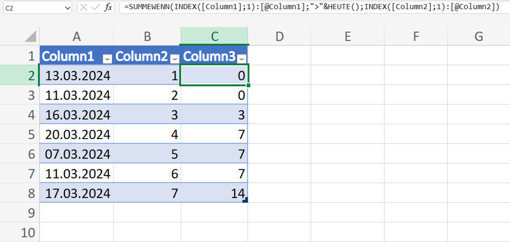 =SUMIF(INDEX([Column1],1):[@Column1],">"&TODAY(),INDEX([Column2],1):[@Column2])