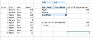 Yes, is there anyway to (1) Only show the sum of weight in the pivot table, and (2) write the formula so that it multiplies the weight by the first column, regardless of what the first column is (e.g. I can switch out the fruit column for the color column, or add any additional column without having to create a new calculated field to for every new column)? Riny_van_Eekelen