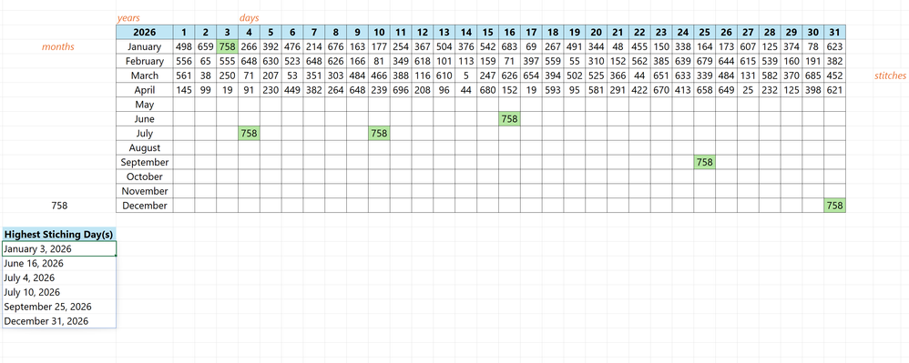 =TOCOL(IF(stitches=MAX(stitches),months&" "&days&", "&year,NA()),2)
