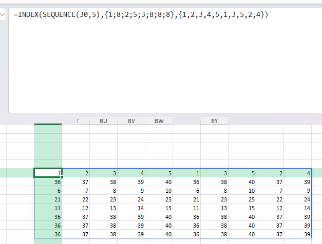 =INDEX((SEQUENCE(30,5),SEQUENCE(30,5)),{1;8;2;5;3;8;8;8},{1,2,3,4,5,1,3,5,2,4},1)