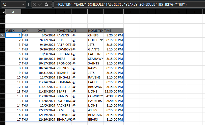 - sf49ers19238597Iron Contributor- m_tarlerBronze Contributoryou just have to pick the columns you want and make sure there isn't anything else entered in any of the 'spill' cells =CHOOSECOLS(FILTER('YEARLY SCHEDULE'!A2:G273,'YEARLY SCHEDULE'!B2:B273="THU"),4)