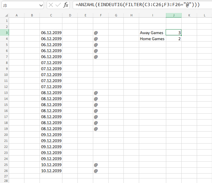 - Hendew44Copper ContributorHi Niko, thank you for your help. I did try that earlier. I don't know if you can see my snip it screen attachment to show what I mean. Column G is the opponent. In column F, an Away game is a symbol of @ and in column C the dates are in chronological order Ascending from oldest to newest. No matter how I slice it countifs won't work because it doesn't consider dates after c3 as unique for some reason. I hope that explains it better.