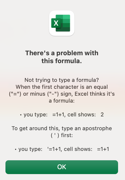 Hi I am using an apple computer and I cannot enter a formula as it is not letting me put it in. It keeps showing this pop up message (see below). Any advice is welcome!