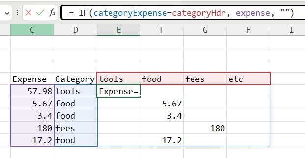 I have put my accounting data in to Excel. Different expenses should be placed in different columns. E.g tools, food, fee, etc. Lets say I have 5 different expense categories, but now all expense values are in column C. I need a formula for typing the value 1-5 (1=tools, 2=food etc) in a cell in column D, that copies the value in C to E, F, G, H and I, according to the category of the expense. What formula can I use to do this?