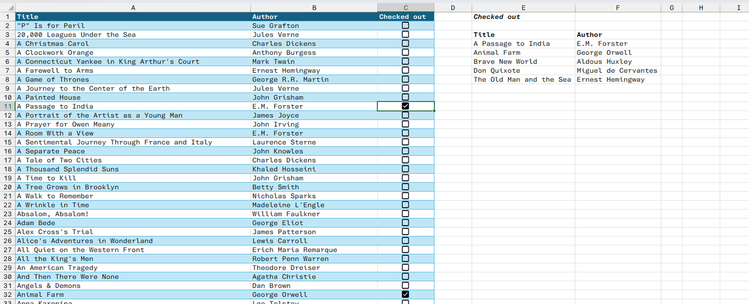 =FILTER(BooksTbl[[Title]:[Author]],BooksTbl[Checked out],"None")The data arranged: