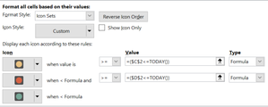 So far, I understand you are trying to use icon sets in a spreadsheet to visually represent the status of tasks based on dates in columns C and D.