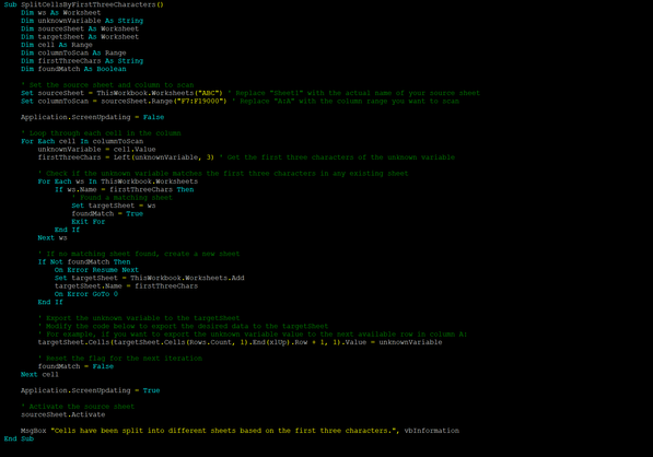 Sub SplitCellsToSheets() Dim sourceSheet As Worksheet Dim targetSheet As Worksheet Dim sourceRange As Range Dim cell As Range Dim firstThreeChars As String Dim lastRow As Long ' Set the source sheet Set sourceSheet = ThisWorkbook.Sheets("Sheet1") ' Replace "Sheet1" with your source sheet name ' Set the source range lastRow = sourceSheet.Cells(sourceSheet.Rows.Count, "A").End(xlUp).Row Set sourceRange = sourceSheet.Range("A1:A" & lastRow) ' Assuming the data is in column A ' Loop through each cell in the source range For Each cell In sourceRange ' Get the first three characters of the cell value firstThreeChars = Left(cell.Value, 3) ' Check if a sheet with the first three characters exists, create one if it doesn't On Error Resume Next Set targetSheet = ThisWorkbook.Sheets(firstThreeChars) On Error GoTo 0 If targetSheet Is Nothing Then Set targetSheet = ThisWorkbook.Sheets.Add(After:=ThisWorkbook.Sheets(ThisWorkbook.Sheets.Count)) targetSheet.Name = firstThreeChars End If ' Copy the cell value to the target sheet targetSheet.Cells(targetSheet.Cells(targetSheet.Rows.Count, "A").End(xlUp).Row + 1, "A").Value = cell.Value Next cell End Sub4. Update the code with the appropriate sheet names and column references as necessary.