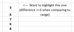 tstephen15 I assume you already have a provided range of scores in $D$2:$D$8 against which you compare each score on each row of column A to see if the difference between the score in column A with the min (lowest bound) or with the max (highest bound) of the provided range is >=3 (not sure this is what you mean by stating "score with a difference >= 3 when comparing it to a range of provided scores").