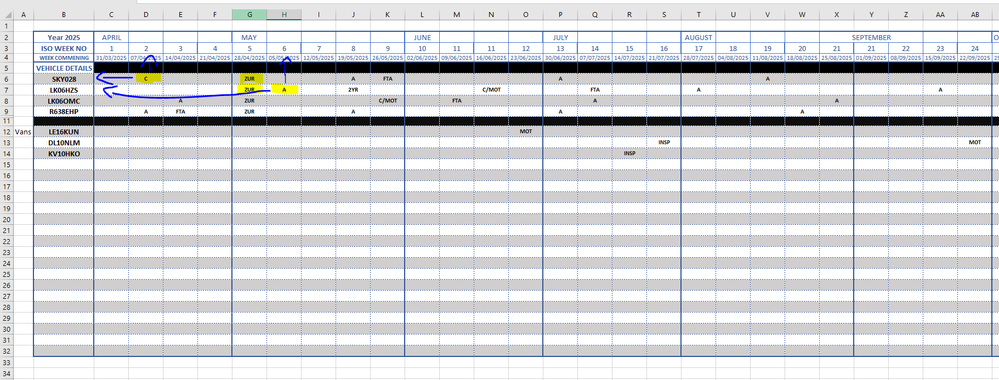 The idea is that i will then be able to sort by any of the vehicle registrations or iso week no or text in the cell