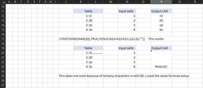 I have a TEXTJOIN IF formula that works but in the target location i get a #VALUE. I went looking on why and couldn't find a reason. I noticed that the cell it was grabbing would work if there was maybe 50 characters of text in the cell. I had 137 characters. is there a way to increase the amount of information pulled from a cell? It works normally if i do a regular =A21 for example. It doesn't even grab part of the information, i just get the #VALUE. I just don't know why it wont grab all the information in the cell. Its almost like once i put an array to it it wont work.