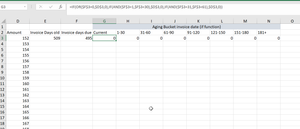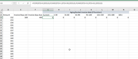 Hello, I am struggling with this formula in order to have the amount (column D) in the correct bucket (columns G, H, I, J, K, L, M or N) based on the number of days in column F. I have tried wit...
