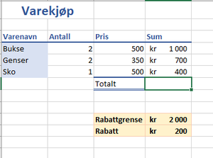 If the totalt amount of money spent on shopping is over the discount limit at 2000NOK, the discount must be automatically deducted from the total. How do i have to write the function?