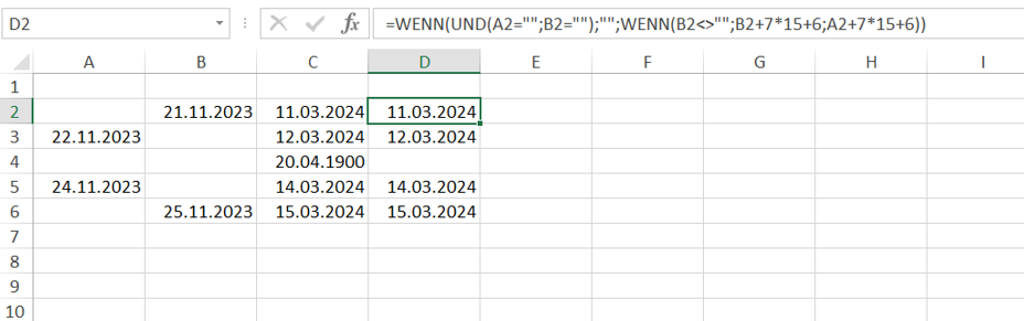 This formula returns 20.04.1900 or 111 in cell C4. B4 isn't <>"" therefore the formula calculates A4+7*15+6. Since A4 is 0 the calculation is 0+7*15+6 and the result is 111. The format of cell C4 is date and 20.04.1900 is the 111th day since 01.01.1900.