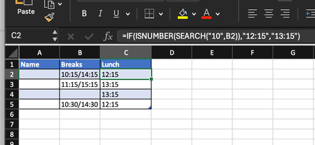 Hi, I'm fairly basic with my excel knowledge. I have the below formula and table. The break column is a drop down box with selected times, I want the lunch column to return either a time of 12:15...