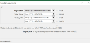Hi Community, I really could use your help to figure out what I am doing wrong. Please see my issue below. =IF('Salary Cap Cost Share Cal'!$J$7="Yes",Year_1!F7*(1+SETUP!B18)),('Salary Cap Co...