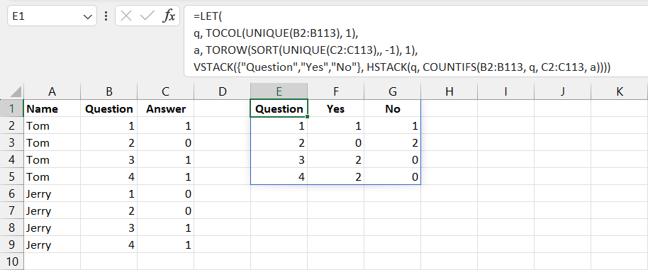=COUNTIFS(B2:B113, TOCOL(UNIQUE(B2:B113), 1), C2:C113, TOROW(SORT(UNIQUE(C2:C113),, -1), 1))The result in this case would be a 2x4 array representing a count of all Yes and No answers for each question. To create a single cell report, complete with question numbers as well as headers, use the following: