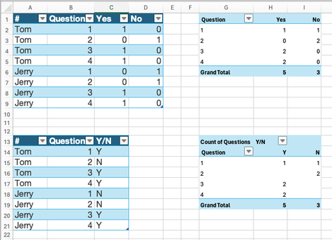 Name Question Answer Tom 1 1 Tom 2 0 Tom 3 1 Tom 4 1 Jerry 1 0 Jerry 2 0 Jerry 3 1 Jerry 4 1 The COUNTIFS function can then be used to get a count of all Yes/No answers for each question. For example, to count all Yes answers for question 3: