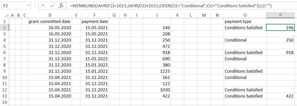 =IF(AND(YEAR(F2)=2021,YEAR(D2)<2021,OR(O2="Conditional",O2="Conditions Satisfied")),J2,"")You can try this formula which seems to work in my sheet.